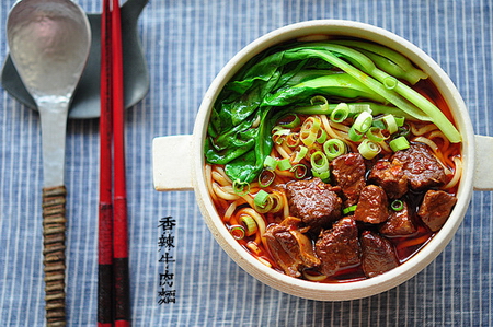 材料:牛肉,面條,小白菜,蔥,姜,大蒜,八角,辣椒,醬油、酒、辣豆瓣醬、麻油。做法:1、牛肉洗凈切塊,氽燙去血水。2、起油鍋,炒香蔥、姜、蔥段、八角、辣椒、牛肉,加入醬油、水、酒1湯匙、辣豆瓣醬1大匙,用中火煮約1小時。3、水燒開,煮熟面條撈出,再燙熟小白菜。4、碗中放入麻油少許、蔥花、牛肉湯,加入面條、青菜、牛肉即可。